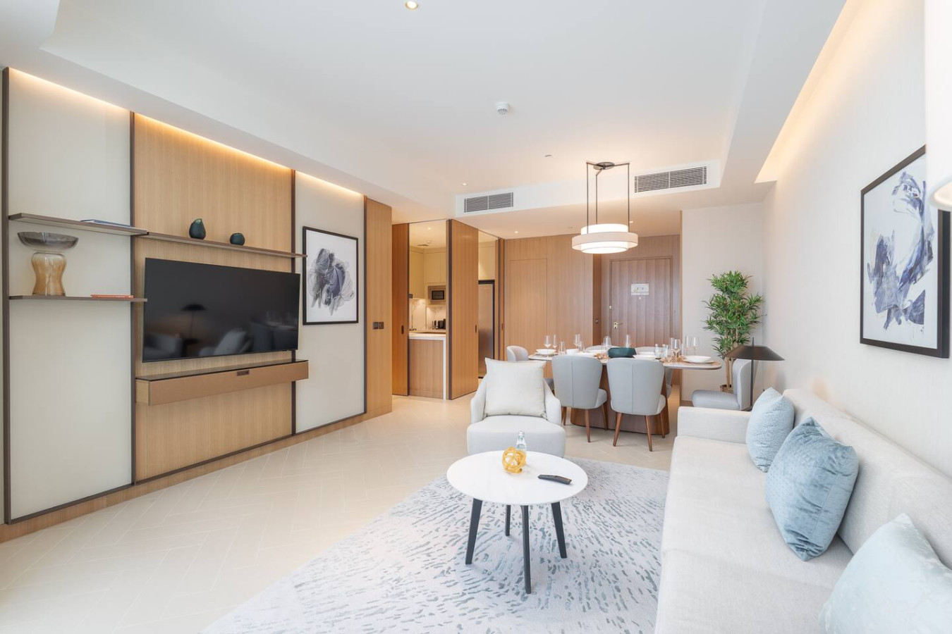 • Living Space: The open-plan living and dining area is designed for relaxation, with contemporary furnishings and large windows that flood the space with natural light.